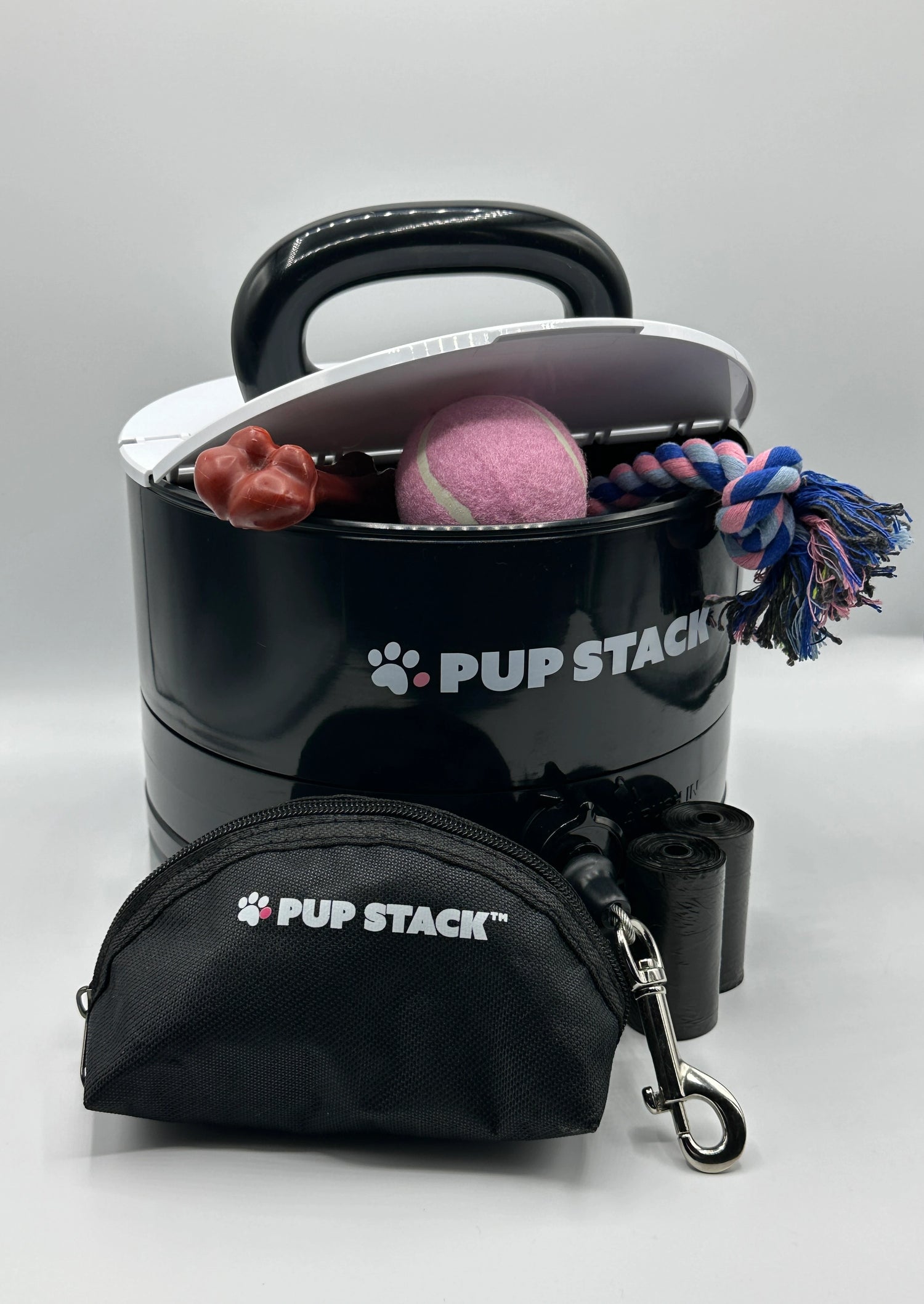 Always have everything you need wherever you go. Treats, poop bags, and chew toys all fit into the Pup Stack's built-in storage container.