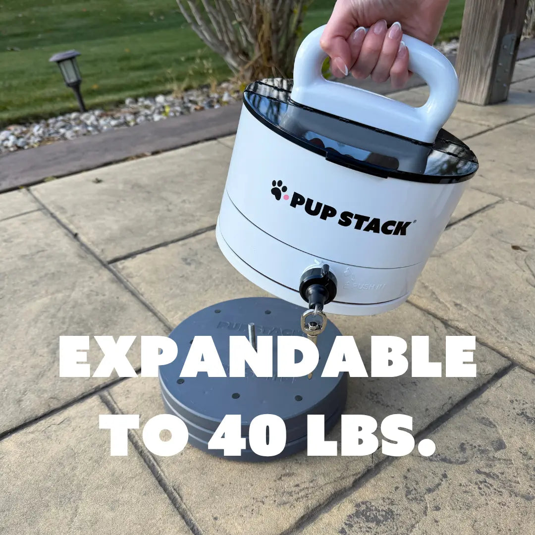 The base Pup Stack comes with a 10 lb. base plate bringing the total weight of the standard Pup Stack to a little over 13 lbs. Additional Pup Stack weight plates can be purchased separately based on your dog's weight and requirements. Please refer to our Pup Stack weight guidelines for more details.